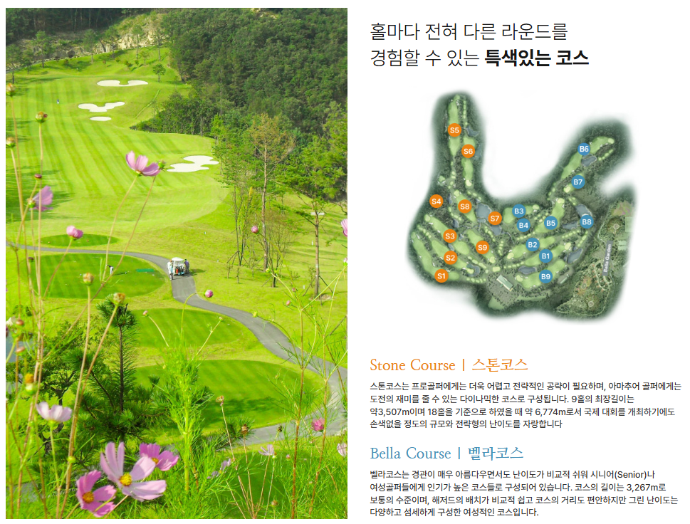 벨라스톤CC는 벨라(Bella)와 스톤(Stone) 두 개의 9홀 코스로 구성된 18홀(파72) 산악 구릉지형 코스입니다. 한국잔디를 사용하여 부드러운 롤링과 안정적인 퍼팅을 제공합니다. 코스는 자연경관과 잘 어우러져 있으며 다양한 난이도의 홀로 구성되어 있어 초보자부터 고급 골퍼까지 모두 즐길 수 있습니다.